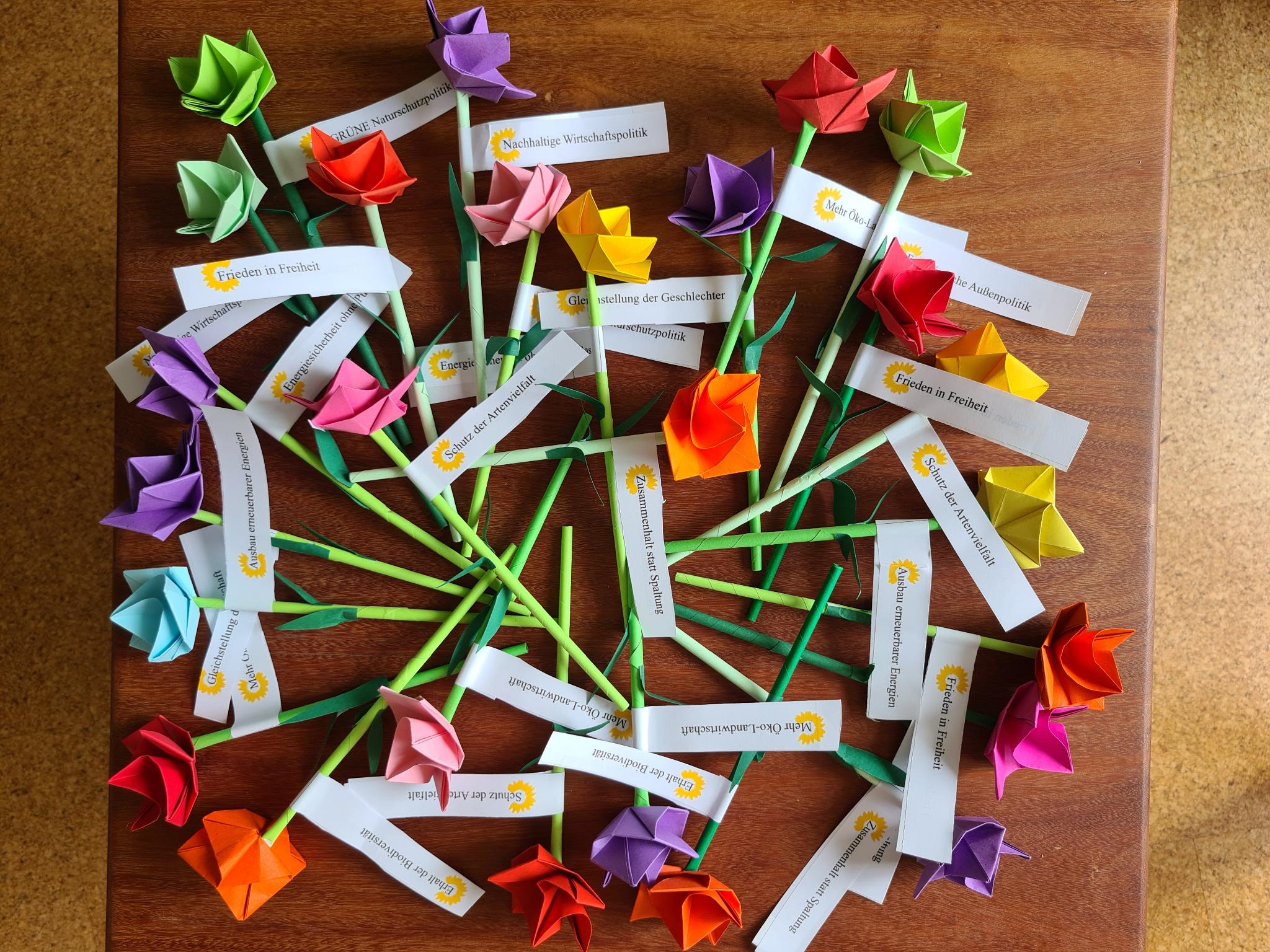 Unter dem Motto “Bunte Blumen Vielfalt” wurden 150 gefaltete Origami Blumen mit GRÜNEN Botschaften u.a. zum Klima- und Naturschutz sowie der Friedenspolitik im In- und Ausland an Passant:innen verteilt. Die Reaktionen waren durchweg positiv, was ein kleiner Hoffnungsschimmer ist nach den schlimmsten Ereignissen der vergangenen Wochen, mit der Fokussierung auf Asyl- und Migrationspolitik, die alle anderen Themen überlagert. Nicht nur am Valentinstag lohnt es sich, bekannten und unbekannten Menschen eine kleine Freude zu machen.